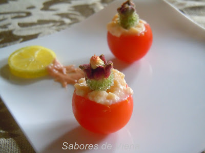 Primera Opción: Con tomates cherry, rellenos de huevo revuelto y pimienta rosa.