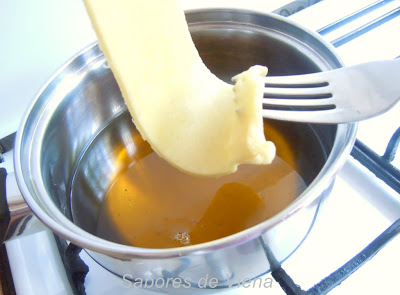 Lo que haremos con las tiras de masa es lo siguiente: Con un tenedor engancharemos un extremo, mientras el otro lo tenemos con la mano. Introducimos en abundante aceite bien caliente el extremo del tenedor y rápidamente enrollamos formando la rosa mientras se va friendo.